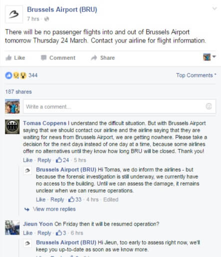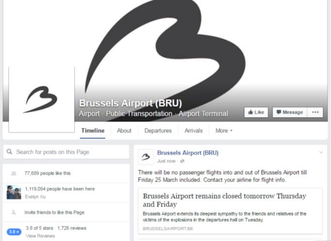 One of the two bombing sites, Brussels Airport (BRU), has established its Facebook page as one of the main points of contact in the region. Shortly after the attacks took place, the page became active, updating its followers on the current situation and how it progressed. Multiple posts encouraged users to call the airport to check on family and friends. The page also sent warnings to stay away from the building altogether.