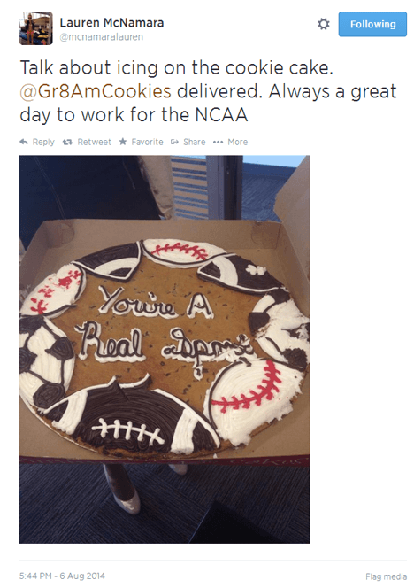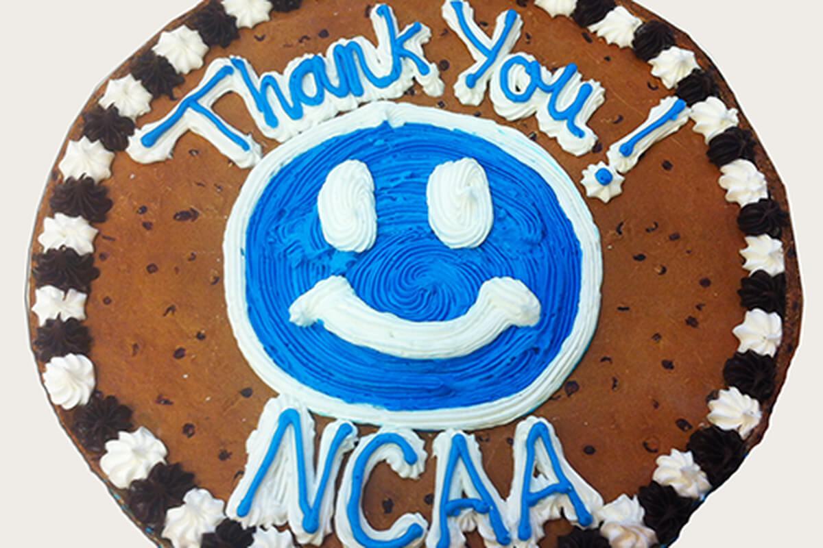 Working in partnership with an Indianapolis GAC franchisee, we quickly produced about a dozen Cookie Cakes carrying the messages that included “Thank You NCAA!” and “You’re a Good Sport!” and delivered them with a very tongue-in-cheek letter to Mr. Emmert.