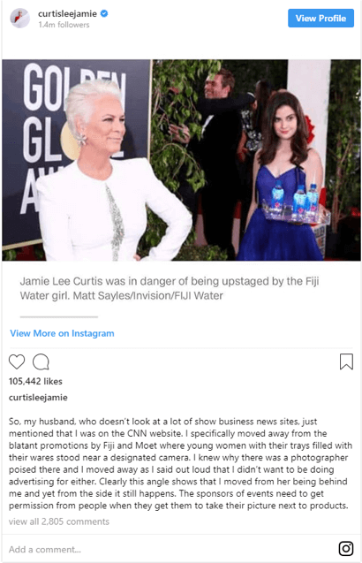 The actress chose to walk the red carpet, putting herself among the Golden Globe signage and subsequent sponsors. If Fiji took the photo to their social media channels and tried to act as if Curtis was sponsoring the water, then that’s a different story and her permission would likely be needed. Yet, after giving a once-over of Fiji’s accounts, it’s clear the brand hasn’t reposted any of the red carpet photos. In my opinion, no harm no fowl.