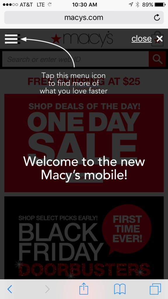 Macy’s does a great job of first making sure their customers understand how to navigate their mobile site by briefly explaining the hamburger menu.