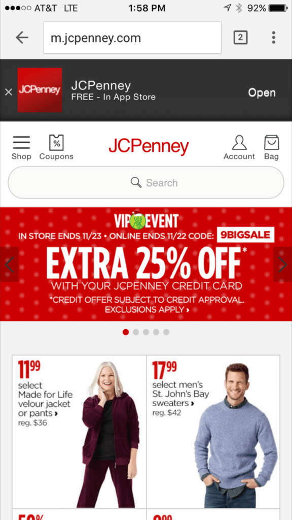 JCPenney does a nice job with their mobile site, keeping it simple with the most important elements at the top of the page. They also have an app available, which they promote at the top of the page for visitors who are coming to the site for the first time.