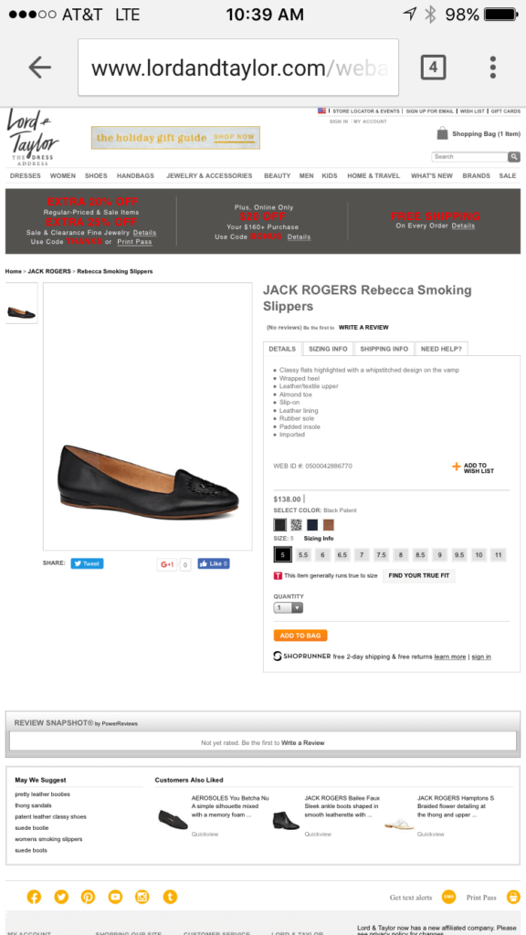 Lord and Taylor hasn’t done anything to make the mobile experience better for their customers. You have to zom, scroll left and right, and will probably get frustrated and leave the site.