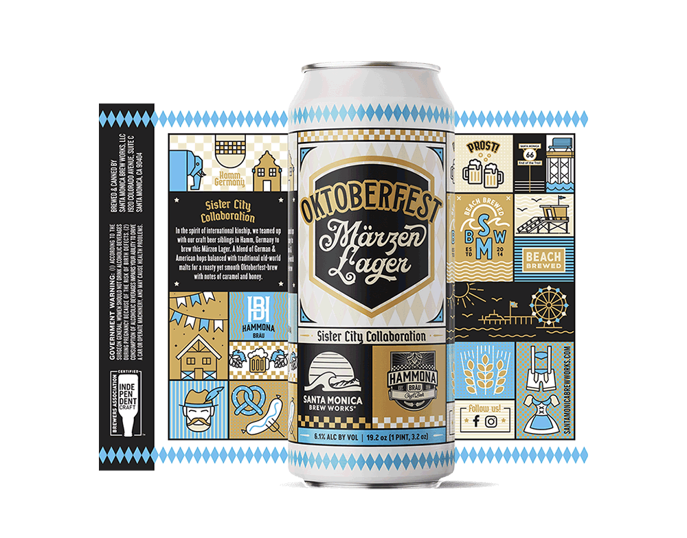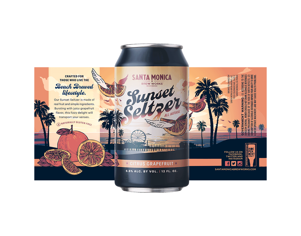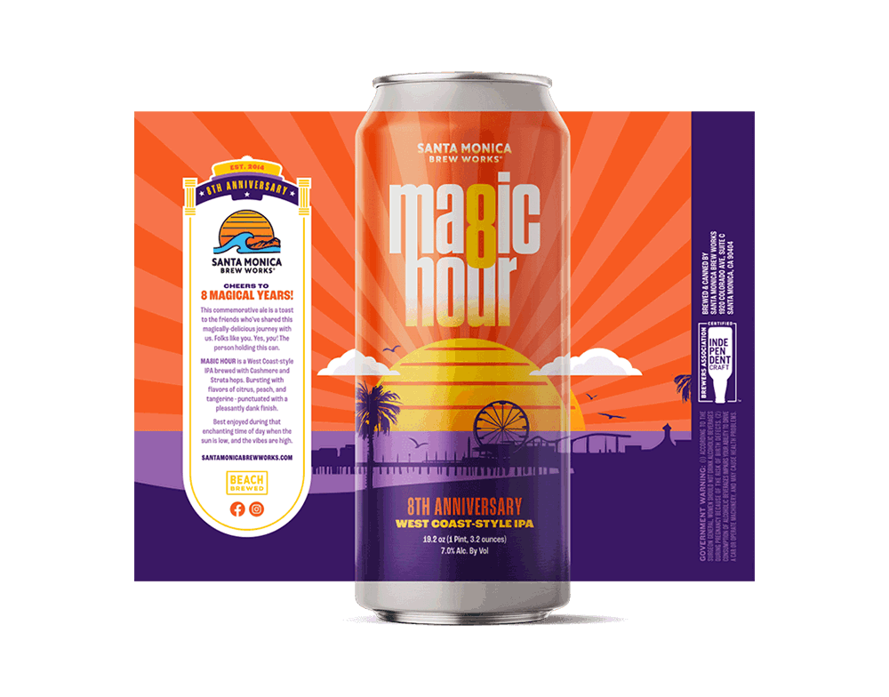 We first tried Santa Monica Brew Works while visiting our equally cool Southern California client, Hot Dog on a Stick. Both brands ooze SoCal charm, so we proposed a partnership, pairing HDOS’s famous hand-stomped lemonade with SMBW’s flagship 310 California Blonde Ale. We named the result “310 Stomped Shandy,” and designed cans that lived up to the hype. Since then, we’ve designed (and drunk) several more cans.