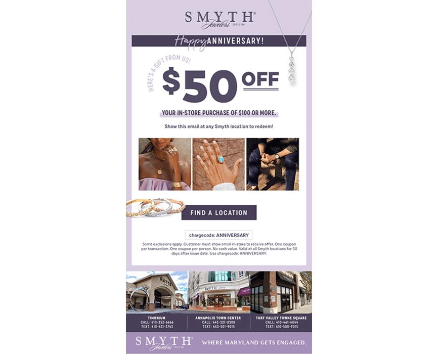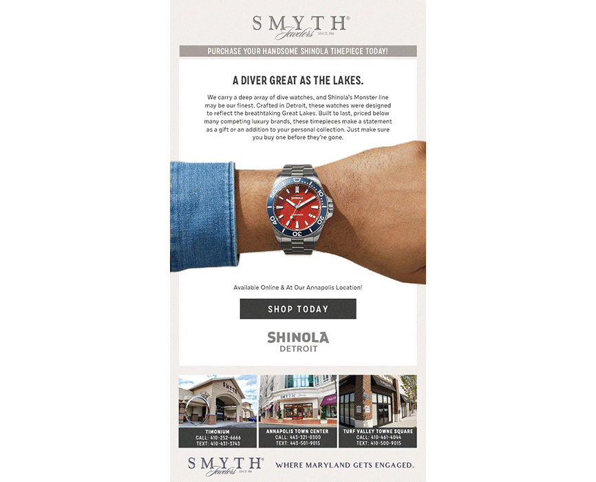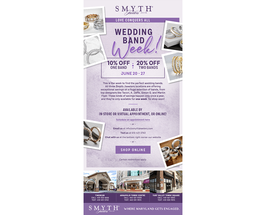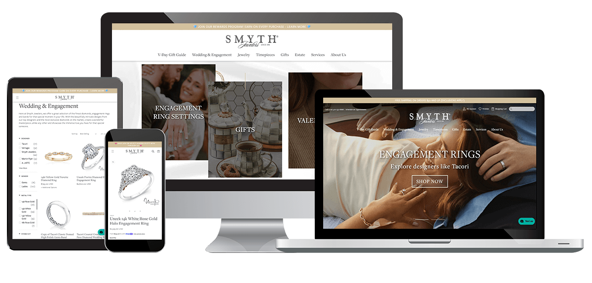 After a long-term, successful relationship that began in 2006, Smyth Jewelers rekindled their romance with MGH in the winter of 2020. We kicked things off with marketing strategy that delivered strong sales in a difficult year, and since then have helped them thrive on a local level in-store and nationally online with consistently bold, brilliant work.